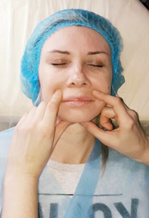 “Alternatingly plucked.” This movement is aimed at correcting wrinkles above the lower lip. Using your index finger and thumb, make pinch movements in the chin area, grabbing the wrinkle. Movements are directed from top to bottom. Repeat 5 times.