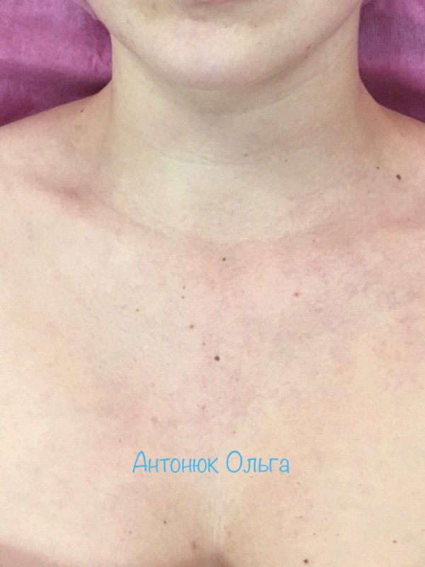 В период неактивного солнца начинаем уход за деликатными зонами с химического пилинга. Поверхностные химические пилинги, в состав которых традиционно входят АНА-кислоты (гликолевая, молочная, пировиноградная, миндальная, лимонная), проводим с периодичностью 1 раз в неделю (фото 2). Эта процедура совершенно проста в применении и результативна. В результате воздействия кислот на клетки эпидермиса (кератиноциты) стимулируются процессы их обновления и деления. Происходит стимуляция нервных окончаний, находящихся в эпидермисе, что приводит к активации фибробластов, продуцирующих коллаген и собственную ГК. В результате процедуры мы наблюдаем улучшение цвета кожи области шеи и декольте, легкий эффект лифтинга и сглаживание неглубоких морщин.