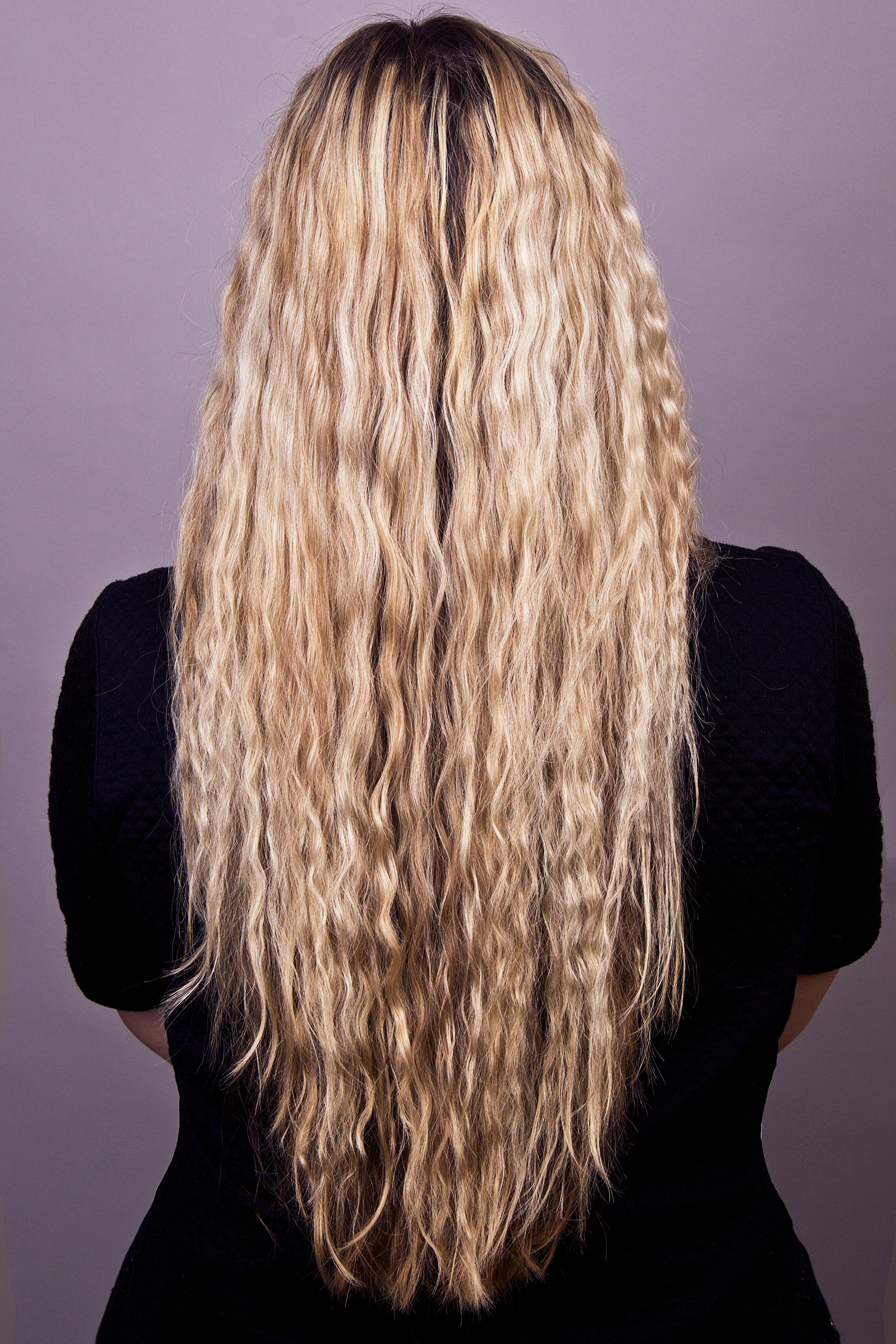 Натуральная база корней (1,5 см) 7 УГТ. Нижне-затылочная и височные зоны: 7 7 УГТ (1,5 см у корней), 8 7 УГТ по длине. Теменная зона – мелирование 10-9 УГТ.