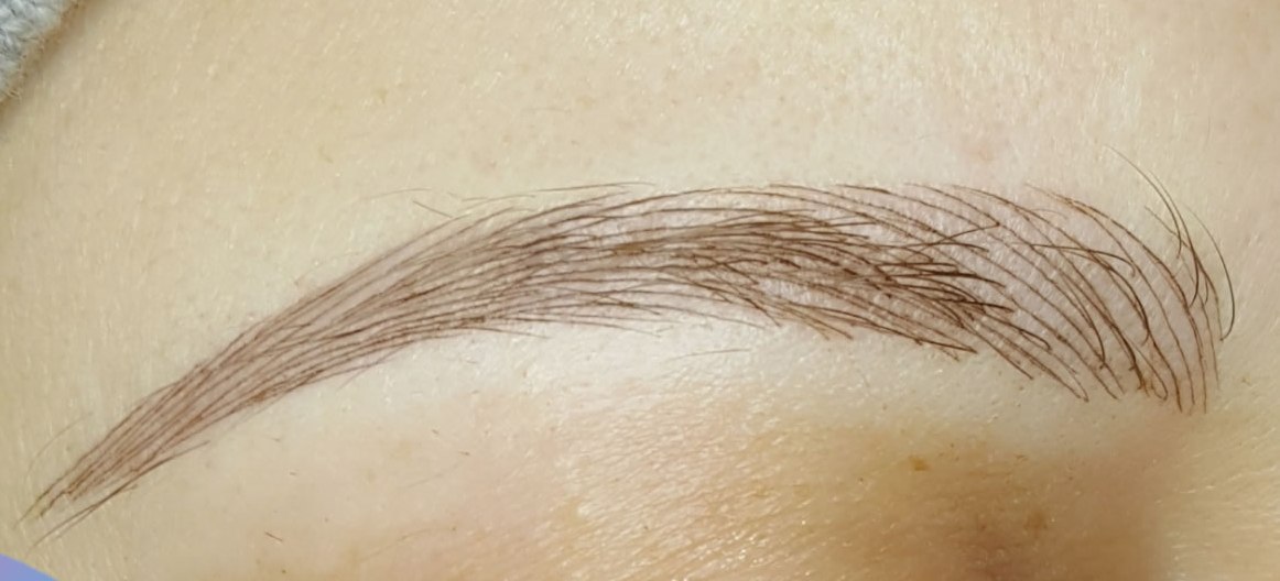 Остановимся подробнее на волосковой технике в микроблейдинге. Так как она очень сложна рисунком и художественным исполнением, нужно отметить, что для ее выполнения необходим хороший опыт. Советуем записываться на эту процедуру только к настоящим талантливым профи с большим опытом работы. Иначе можно получить нежелательный результат – рубцы или, наоборот, поверхностное введение пигмента; примитивную художественную схему выполнения. Если же мастер ПМ строго придерживается множества правил, получаются совсем естественные брови, волоски при этом выглядят очень тонкими, натуральными и держатся дольше, чем при аппаратном методе.